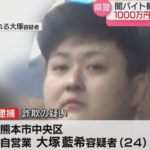 大阪に派遣した特殊詐欺の「受け子」と共謀して、70代の女性から現金1000万円をだまし取ったとして、男が熊本県警に再逮捕されました。詐欺の疑いで再逮捕されたのは、熊本市中央区中央街の自営業、大塚藍希(おおつか あいき)容疑者(24)です。 大塚容疑者は2024年9月2〜3日、別の人物と共謀し、娘を装って大阪府東大阪市に住む70代の女性に電話をかけて「投資で失敗して会社の金を使い込んだ」などとうそを言って、現金1000万円をだまし取った疑いが持たれています。 警察によりますと、娘と連絡が取れた女性が被害に気付き、警察に被害届を出していました。 熊本県警が2024年9月から進める指定暴力団「道仁会」や匿名流動型犯罪グループいわゆる「トクリュウ」の壊滅に向けた集中捜査の中で、この事件での大塚容疑者の関与が発覚したということです。 大塚容疑者は、特殊詐欺の「受け子」を派遣する役割を果たしていたとみられ、今回の事件で「受け子」を担った熊本市に住む当時19歳の知人の男は、別の事件の「受け子」に関わったとして去年9月、大阪府警に逮捕されていました。 また大塚容疑者も、別の事件に「受け子」を派遣してだまし取った金を受け取らせたなどとして、2月5日までに詐欺や職業安定法違反の疑いで3回逮捕されています。 警察は大塚容疑者がこの知人の男を大阪に1週間ほど滞在させ、「受け子」として活動させたと見ていますが、「捜査に支障がある」として大塚容疑者の認否は明らかにしていません。 県警のこれまでの集中捜査では、違法な風俗営業や特殊詐欺の実行役の募集・派遣、覚醒剤関連などに関わったとして、30件を超える事件で延べ60人以上が摘発されています。