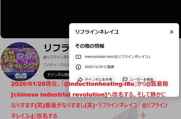 | 2026/01/15 | リフラインネレイユ | @リフラインネレイユ-j | @甄罍耡[chinese industrial revolution] | @inductionheating-l8u |