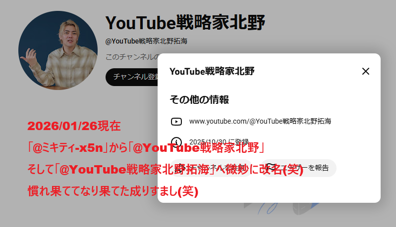 | 2026/01/14 | YouTube戦略家北野 | @YouTube戦略家北野拓海 | @YouTube戦略家北野 | @ミキティ-x5n |