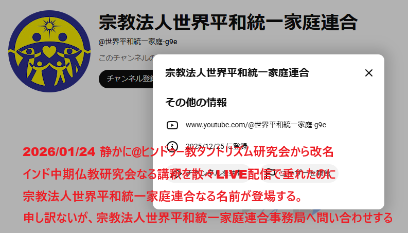 | 2026/01/19 | 宗教法人世界平和統一家庭連合 | @世界平和統一家庭-g9e | @ヒンドゥー教タントリズム研究会[インド中期仏教研究会] | |
