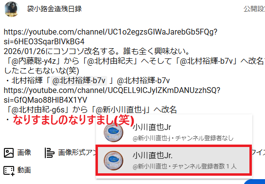 | 2026/01/18 | 小川直也Jr | @新小川直也-j | @北村由紀-g6s | |