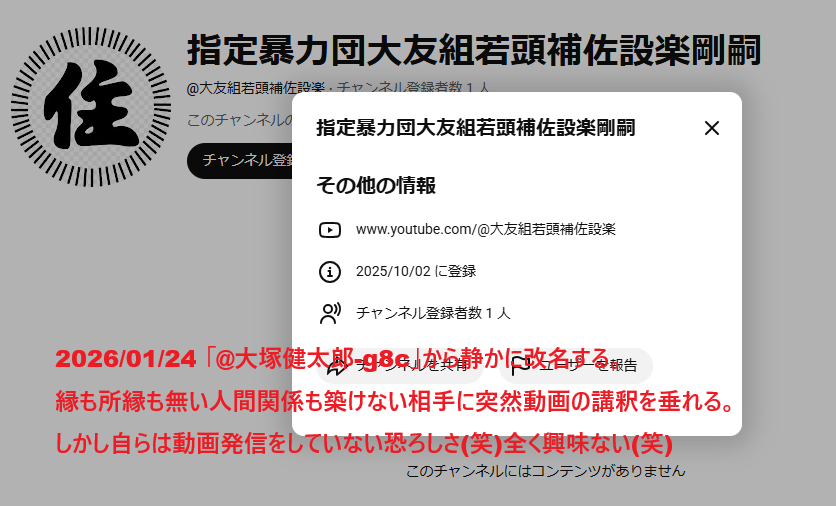 | 2026/01/22 | 指定暴力団大友組若頭補佐設楽剛嗣 | @大友組若頭補佐設楽 | @大塚健太郎-g8c | |