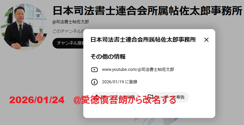 | 2026/01/21 | 日本司法書士連合会所属帖佐太郎事務所 | @司法書士帖佐太郎 | @愛徳慎吾朗 | |
